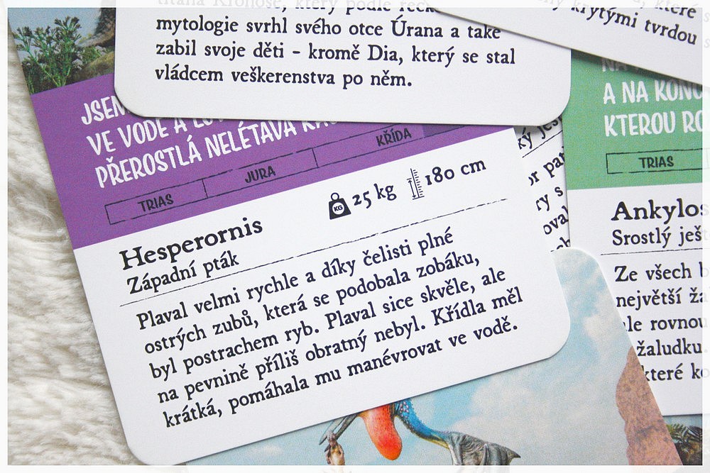 "Víte, který dinosaurus měl drápy dlouhé i celý metr, jak vypadal v druhohorách nejbližší příbuzný člověka? My už ano. Jednoho dne mi totiž starší dcera cestou ze školky řekla: „Mami, dneska jsem parasaurolophus!“ A já řekla jen „Co?“. Tak začala četba, studium i rozhovory s vědci (protože odpovědi na všechny zvídavé otázky dětí v knihách prostě nenajdete) a výsledkem je tato hra."