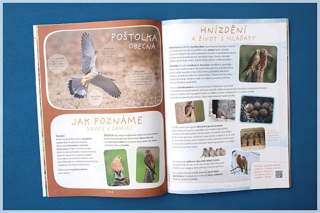 Na další straně se dozvíte jakým způsobem poznáte samce poštolky od samice a popíšete si poštolku s jejím vynikajícím zrakem, černým vousem i 12 rýdovacími pery v ocasu. Také se dočtete jak to mají poštolky s hnízděním a životem s mláďaty, že si hnízdo nestaví i že se mohou dožít až 16 let. Jejich hnízdění můžete sledovat pomocí webkamery díky přiloženému QR kódu.
