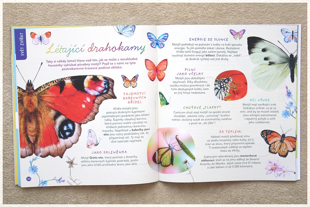 Taky si někdy lámete hlavu nad tím, jak se může z nezvhledné housenky vyklubat půvabný motýl? Na této dvoustraně se dočtete o tajemství barevých křídel, který motýl je jako skleněnka, v čem jsou pilní jako včelky, odkud berou energii, jak fungují chuťové tlapky a mnoho dalšího. Určitě se vydejte do motýlího domu! Zažijete tak motýly mnohem více v detailu a uvidíte na vlastní oči, jak se krmí, jak létají a třeba si některý sedne i na vás :-).