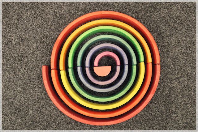 Zatnout zuby, obalit nervy a hurá na stavění. Já si občas nějakou inspiraci najdu ale u holek to nechávám čistě na jejich fantazii. Pro představu jsem sestavila několik staveb, sice určených na Grimms duhu, ale po menších úpravách je zvládnete sestavit i s více oblouky. Hlavně skládání na sebe do výšky je úplně tou nejzákladnější stavbou, která baví děti od malinka - včetně bourání samozřejmě. Mladší děti zůstanou u základních staveb, starší děti už vymyslí něco komplexnějšího a tím, že zapojí fantazii bez návodů, taky samy dokážou přijít na to, jestli jejich stavba bude fungovat a kde ji musí jak podložit, aby nespadla. To mi přijde naprosto geniální ve smyslu plánování, stavění i nápravy chyby, než skádat podle obrázků.